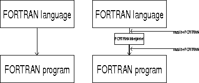 which we can guarantee by taking those end interfaces, labelled Algol Language and Algol Program entirely into the operation, replacing not only the link between them but those levels themselves. This way, we never try to link levels which will be incompatible, but can always insert an extra level in between as a buffer, with the appropriate language definitions for the previous evaluator. (The ability to do this depends on an evaluator being provided written in the new language.) Unfortunately, this may add more levels of interpretation, and so perhaps should be avoided in practice, for efficiency.
